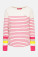 Streifenshirt für Damen von derbe in Türkis Weiß und Gelb. Klassisches Ringelshirt? Ja – aber mit frischer Energie! Die pinken Streifen treffen auf farbige Colour Blocking Details am Ärmelbündchen mit breiteren Streifen in Türkis, Gelb und Weiß. Der cremefarbene obere Bereich sorgt für Ruhe im Look, während der Rest gute Laune macht. Bequem, weich und perfekt für alle, die den Norden im Herzen und Farbe im Alltag tragen. Das Model ist 176 cm groß und trägt Größe M.