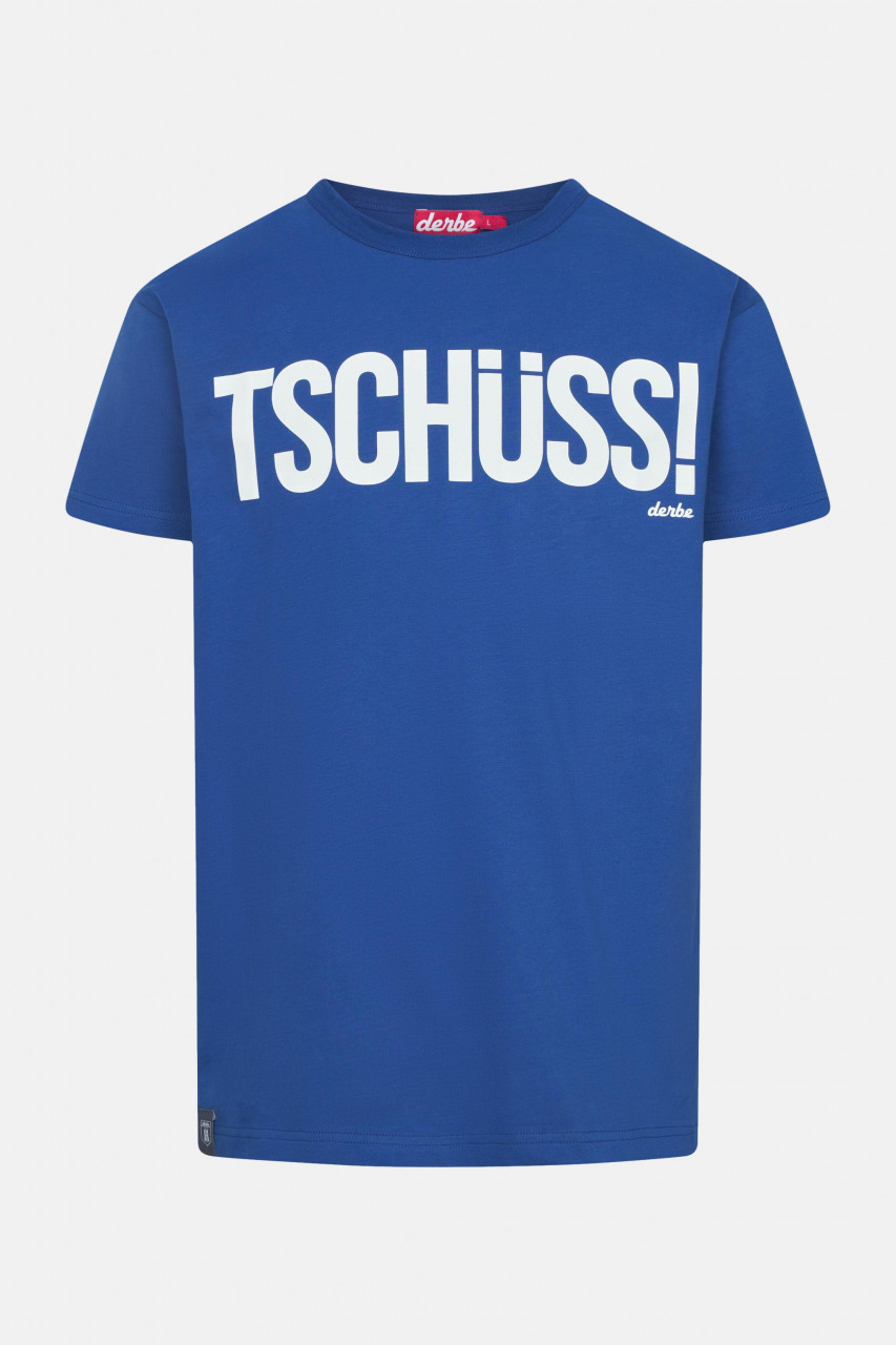 Blaues Herren T-Shirt von derbe mit Schriftzug Print. In Hamburg sagt man Tschüss! Ebenso wie Moin als Begrüßungsformel fest etabliert ist, darf das Tschüss am Ende einfach nicht fehlen. Tschüss, das heißt auf Wiedersehen. Das Model ist 180 cm groß und trägt Größe L.