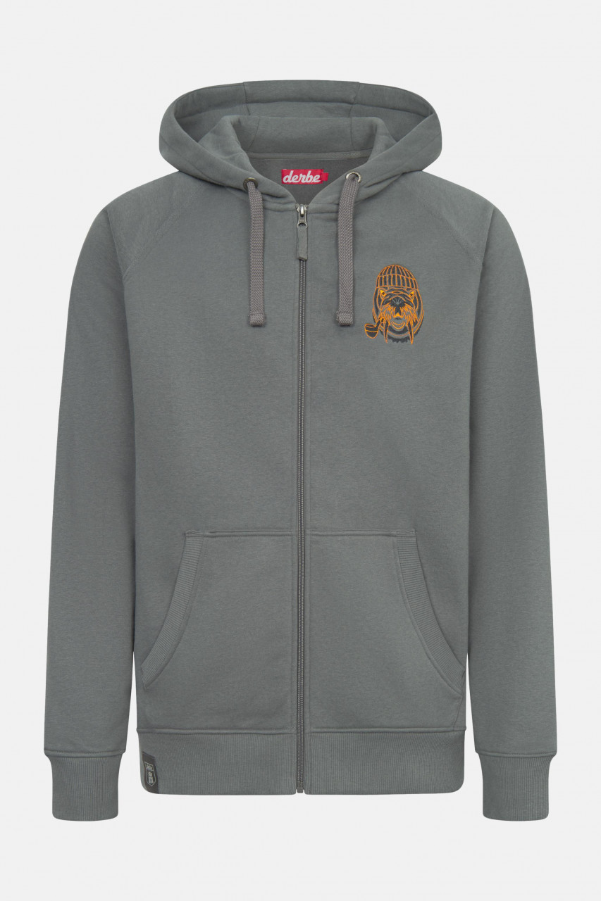 Derbe Kapuzenjacke für Herren in Grau mit Walross Stickerei. Derbe Liebe für das Walross! Das Model ist 180 cm groß und trägt Größe L.